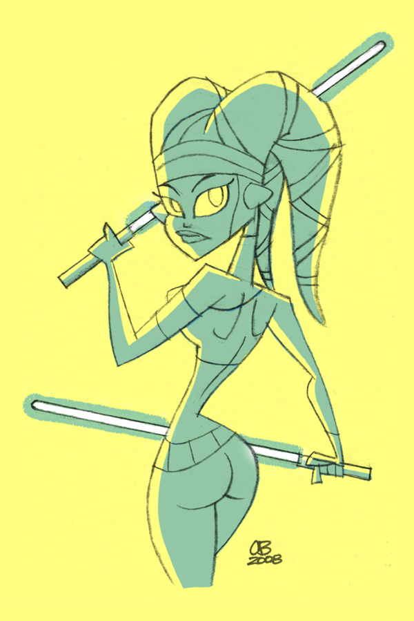 "I’m a typical night owl artist, and often stay up late drawing, so I usually roll into work around 10 AM, grab some coffee, and settle in. Sometimes I need to read a new script, but most often I’m busy attacking already in-progress designs for the latest script or storyboard. The day moves pretty swiftly once the drawing begins, but I always take time to walk around and see what everyone else is doing (It helps to get an idea of what the entire show is looking like instead of just your one little area), and usually try to get outside for lunch with friends– it’s important to actually see some sunlight and get fresh air to recharge your batteries. Usually by 7 PM I call it a day, unless I’m in the middle of a drawing and in “The Zone”; Sometimes you can’t stop while the drawings are flowing!"Chris describes the process by which he works; he will do initial sketches on paper then scan them into photoshop and go over them digitally with a wacom cintiq.
